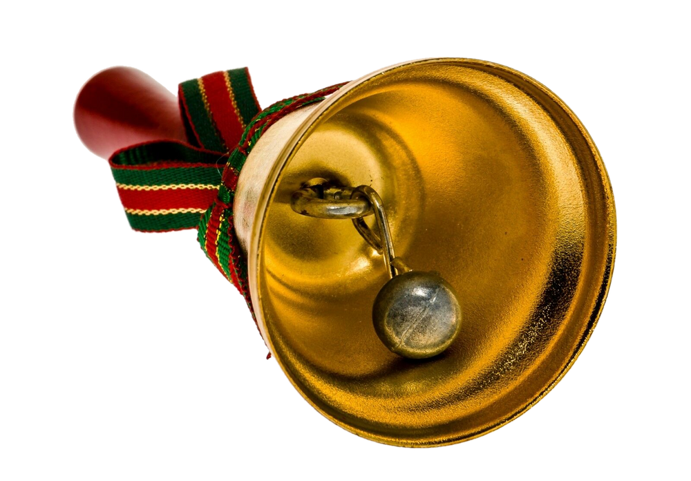 Old fashioned 5" tall Gold Hand Bell with red wooden handle, ribbon for hanging and red/green bow with metallic gold accent.