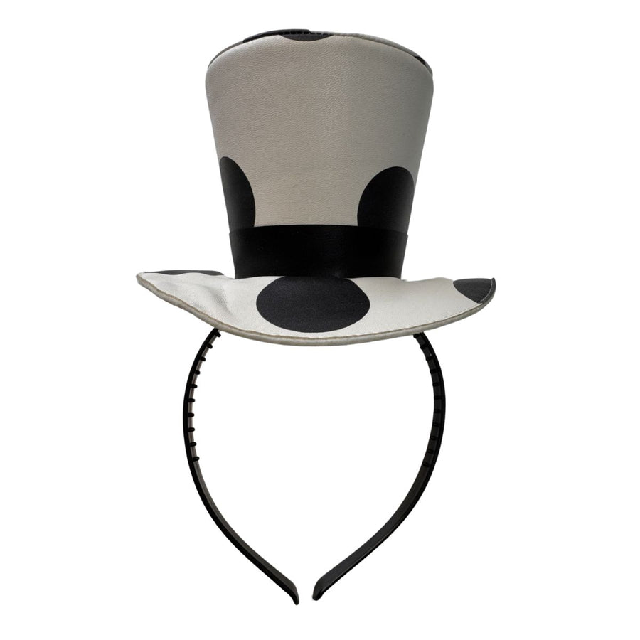 Add a fun twist to your look with this playful mini top hat! Crafted from leatherlike material, it features an off-white base adorned with large black polka dots. The crazy clown design brings a quirky charm, while the attached headband ensures easy, secure wear for any party or costume event. Perfect for standing out with a touch of whimsical flair.