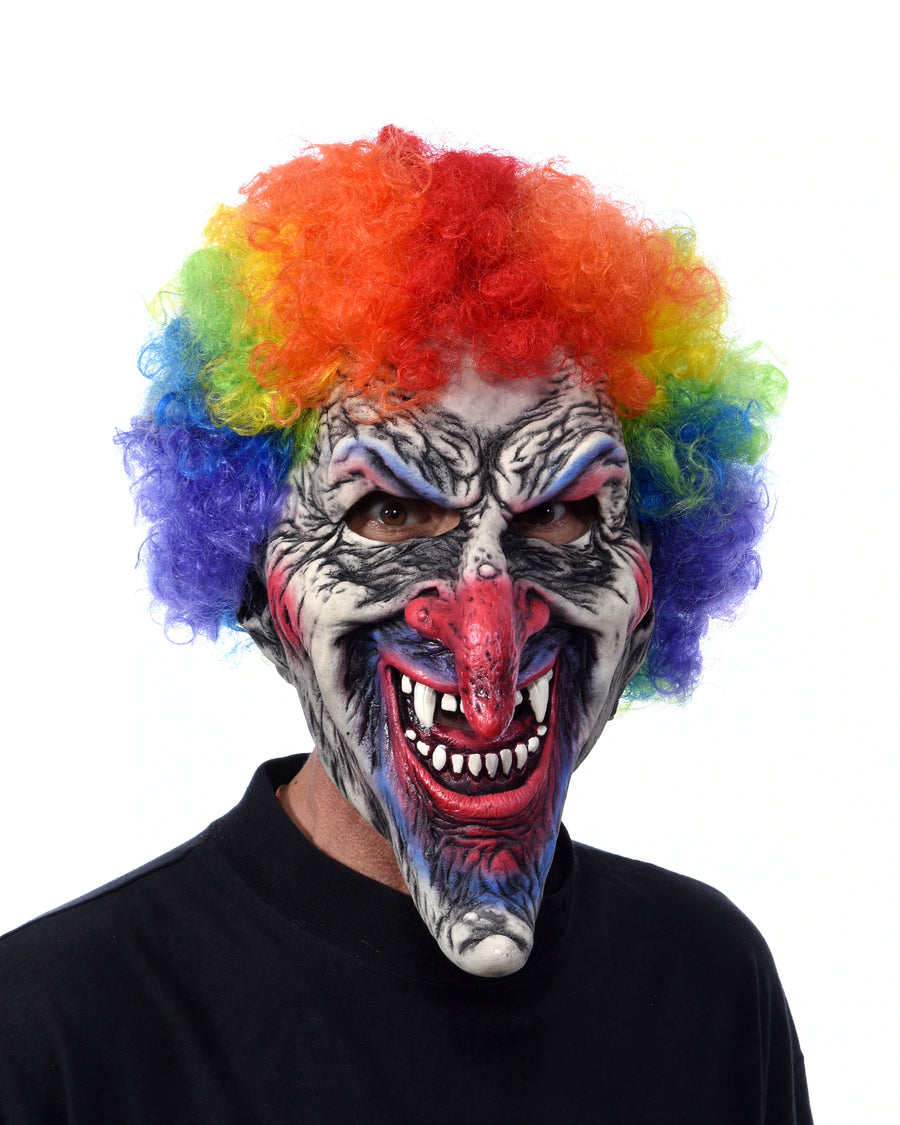 Zagone Studios Dastardly Evil Clown sculpt with giant rainbow hair. Exaggerated nose and chin combined with a DASTARDLY smile. Very comfortable to wear with excellent visibility. Perfect as a decoration for haunted mazes.