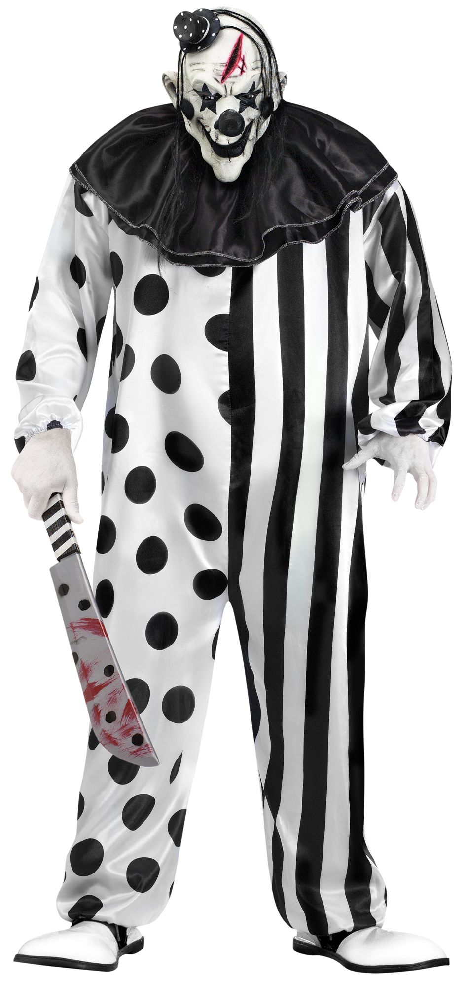 The Halloween horror clown costume with mask consists of a black and white jumpsuit, a horror clown mask with hat and a collar. The jumpsuit is oversized, on the right side it is white with black dots, left black and white stripes. Arms and legs have an elastic band at the bottom. The black shiny collar covers the shoulders, chest and upper back. The full head mask shows black lips, black nose and black stars.