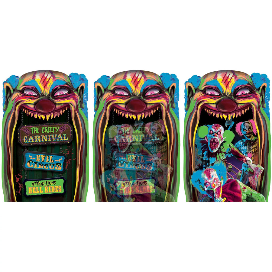 Experience fright and delight all at once with our Creepy Carnival Clown Blacklight Reactive Lenticular Cutout. At 18" x 12", it's the perfect size to add a touch of terror to any space. Plus, it features blacklight reactive technology for an otherworldly glow.