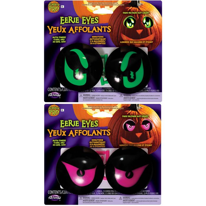 Illuminate your Halloween decor with our Fade In/Fade Out Light Up Pumpkin Eyes. This set includes a stencil, connecting wire, and pegs for easy installation. With 2 colors/styles to choose from, these pumpkin eyes add an eerie touch to your display. Batteries are included for your convenience.