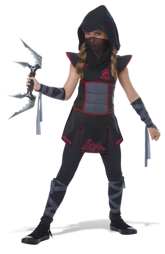 Product Description: No one is better, her strike is fierce and bold. The Fearless Ninja girls' costume is a black hooded tunic dress. It comes with a pair of leggings with attached leg ties, a pair of arm wraps with attached ties and a sheer mask. Shoes and weapon not included.