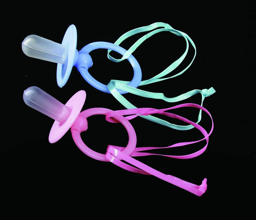 This Jumbo Pacifier is great as a prop and can also double as a napkin holder or decoration at a baby shower. It also makes a great gag if you have a giant baby that won't quit crying, friends who are soon to be parents, or they can be used in adult "baby" Halloween costumes. This 6.25" x 5.6" x 2.65" pacifer is available in blue & pink and you will receive a random color. 1 per package.