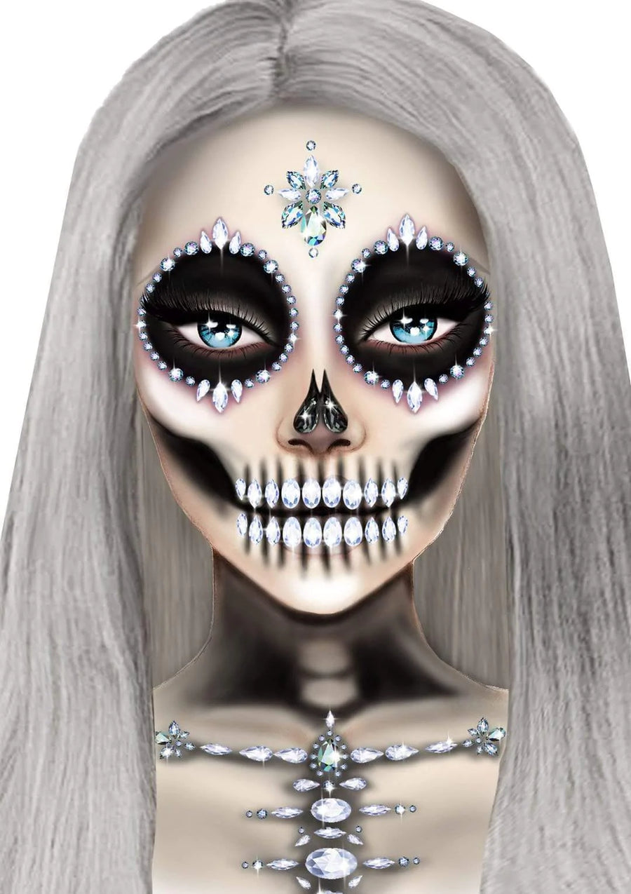 - COMPLETE THE LOOK: Create a super spooky skeleton costume or beautiful day of the dead look with these gorgeous jewels! Pair with your favorite skeleton bodysuit or sexy black dress for a night of Halloween fun. Easy to apply, just peel and stick; Reusable with eyelash glue.
