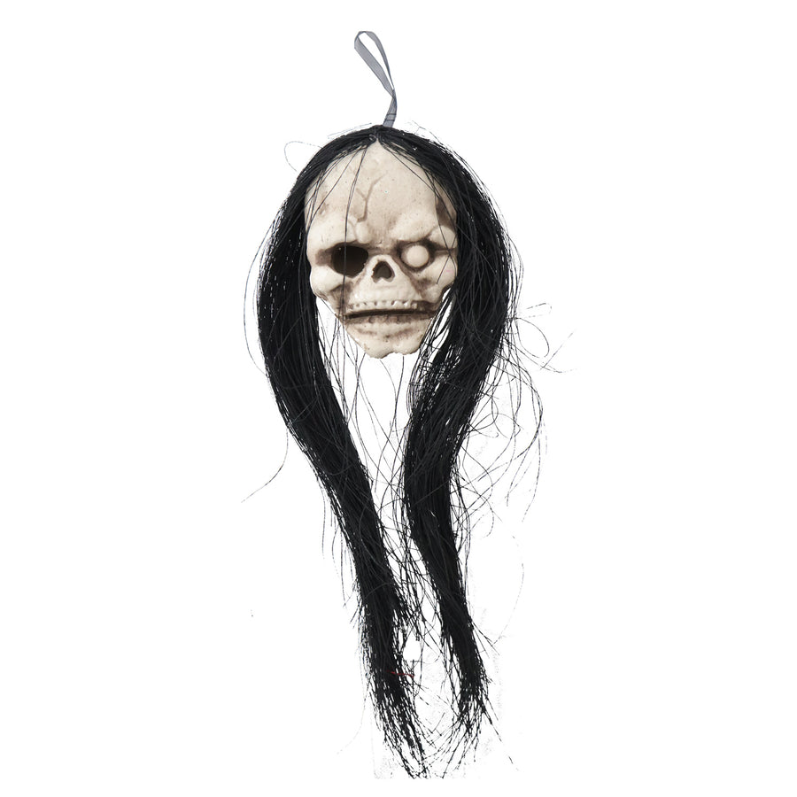 Add a spooky twist to your decorations with this Scary Skull Head complete with string hair. The 6-inch head and 18-inch overall length make it a perfect size for Halloween parties or playful pranks. Its eerie yet fun design brings a mischievous spirit to any room or event.
