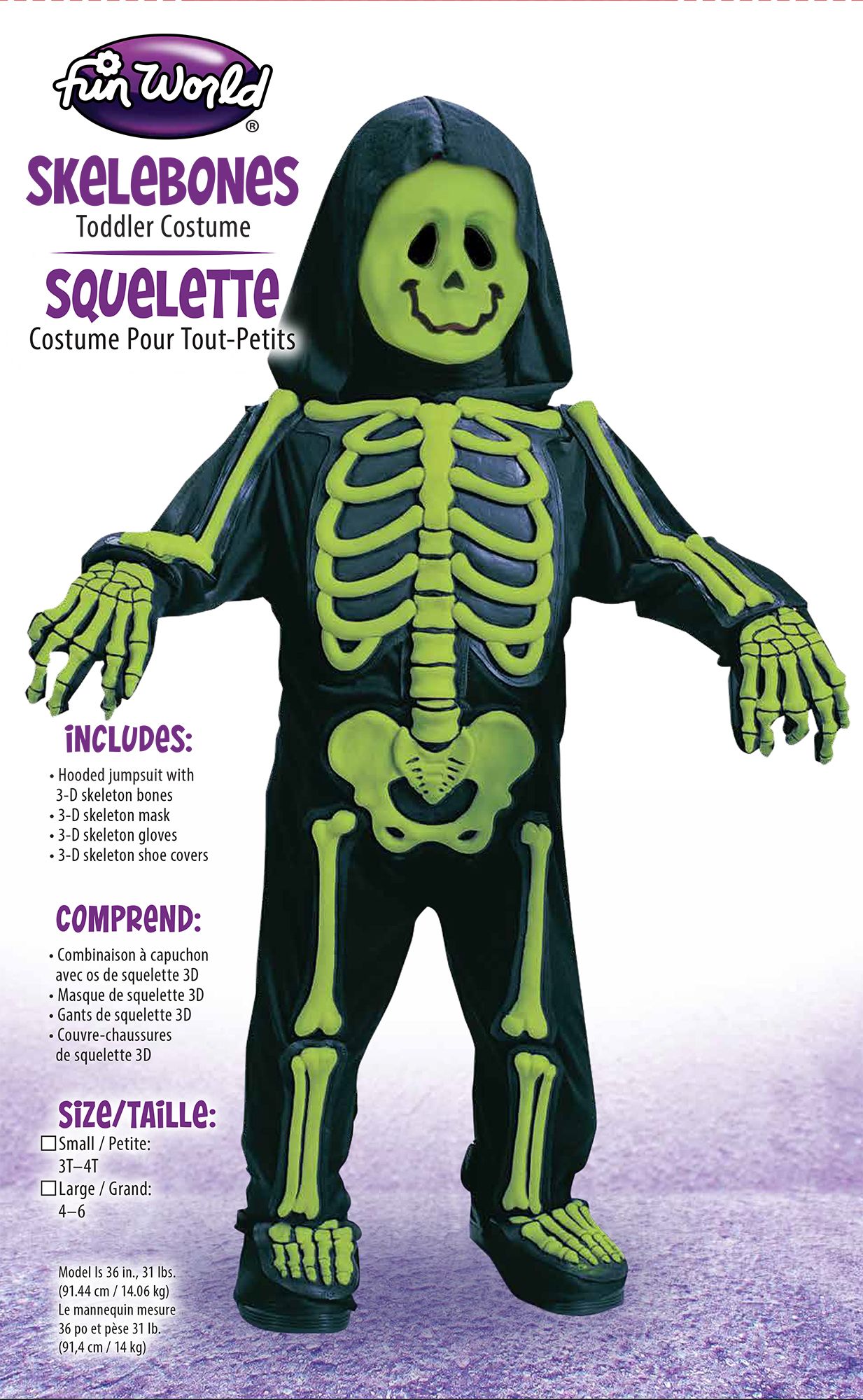 A classic costume idea for Halloween just got an upgrade with the Skelebones costume for boys. This traditionally styled skeleton costume offers an attached hood and three-dimensional boot tops. The mask and gloves mean that this costume covers the entire body and offers a realistic dress-up and festive skeleton style. Add additional accessories such as a top hat or a knife or just wear this look on its own to get in the Halloween spirit. 100% polyester.