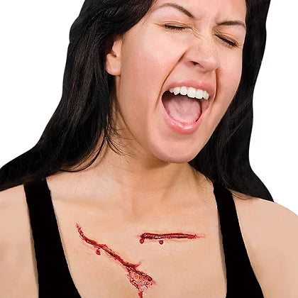 The Woochie Slash Set Wound is a package of 2 latex prosthetic make up pieces, perfect for creating a realistic and gruesome open gashes. Apply with spirit gum or other prosthetic adhesive for a secure fit (adhesive not included). Perfect for Halloween or special effects makeup! The 2 pieces vary in size & shape, but are 3 to 4 inches in size.