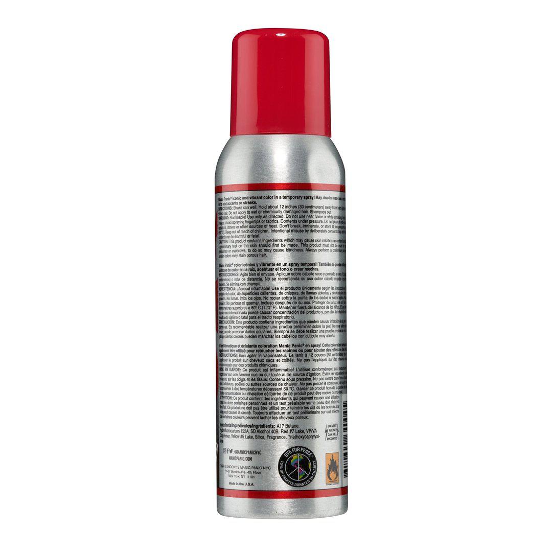 Manic Panic’s® most iconic and vibrant colors are now available in temporary spray-on color and root touch-up! The uses are limited only by your imagination! Our formula works on all hair types and color levels from light to dark. Use it to create colorful streaks and tips, as a root touch-up or color refresher, or as an all over color. Our “Stardust” hair and body glitter spray also doubles as a gorgeous highlight on the body for extra glimmer and glitz, and imparts vibrancy over any hair color. In keeping with our groundbreaking heritage of cosmetics with a conscience, all 8 shades are 100% Vegan and Cruelty-Free and are also free of parabens, gluten, ammonia, resorcinol, PPD and phthalates for a healthier you and a healthier planet. As with all of our products, 15% of the profits are donated to various charities.