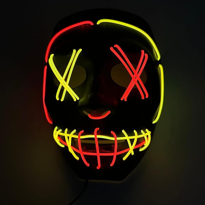 Step into the spotlight with the Heavy Cross 2-Color Hatch Mask, perfect for anyone ready to make a bold, unforgettable entrance. This adult one-size-fits-most mask conceals your identity while transforming you into a memorable, fearsome figure. With the press of a button, watch as vibrant yellow and red light-up wires illuminate the intricate design, making you impossible to ignore. Whether you're gearing up for a night of thrilling mischief or just want to dazzle the crowd, this mask brings your character to life with fiery flair.