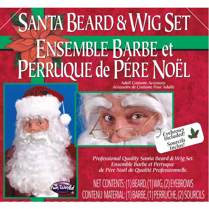 Transform into the ultimate Santa Claus with this Santa Wig & Beard Set. Made with white synthetic fibers, this set includes a full wig, thick beard, and two eyebrows for a complete transformation. Perfect for holiday events, parties, and productions, this set will bring the magic of Christmas to life.