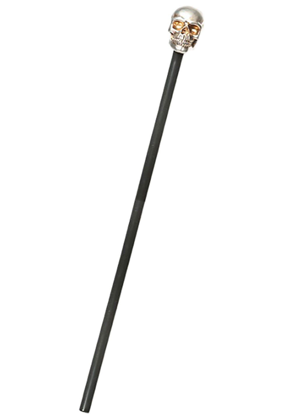 Complete your skeleton or vampire costume with this Plastic Silver Metallic Skull Cane. It features a black and silver cane that requires some assembly. Impress friends and family with this unique accessory.