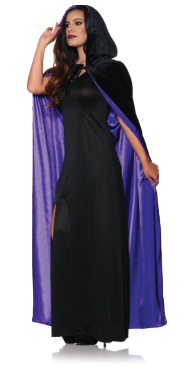 Velvet hooded cape with satin lining, tie-front cape with hood.