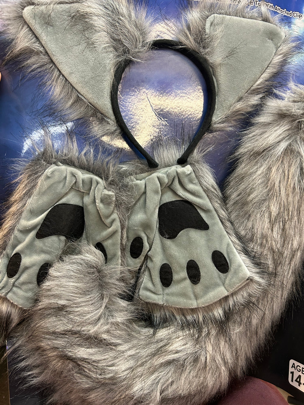 Headband with attached ears, fingerless gloves, with faux fur adornment, tail with attached clip. One size fits all. Available in 2 color choices,