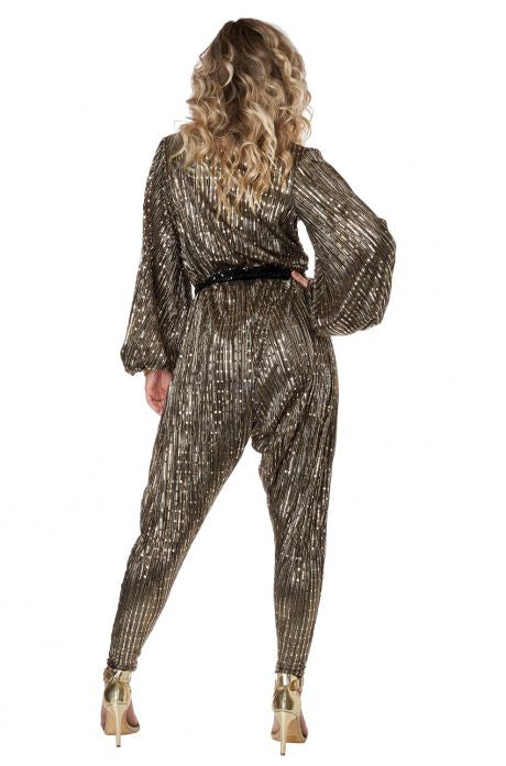 Make a royal statement on the dance floor. The Gold Disco Queen costume is a jumpsuit and sequined belt. Elastic belt is Velcro closed. Does not include jewelry, shoes.