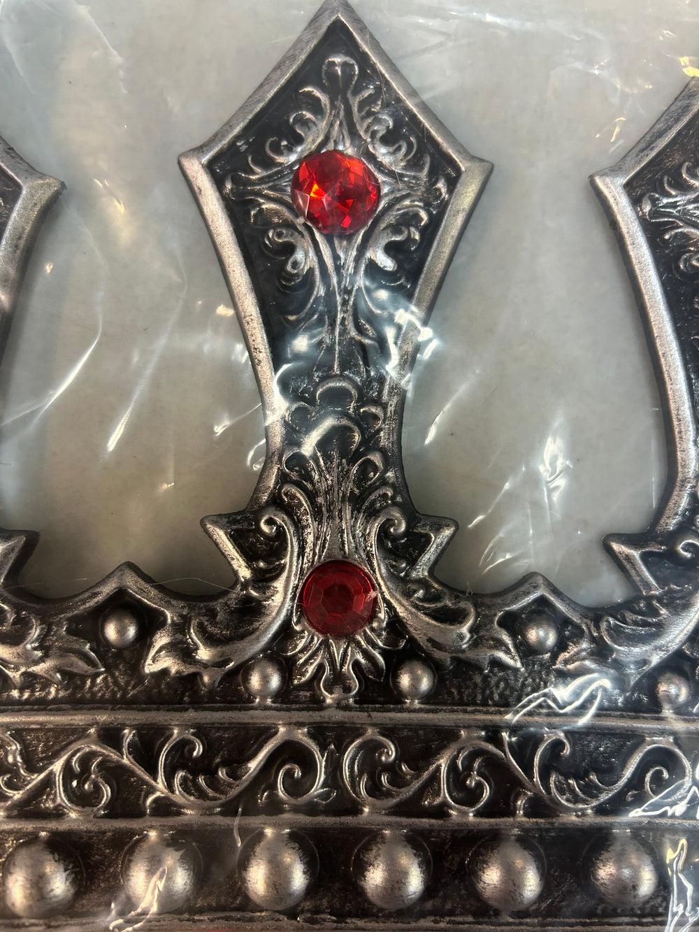 This King's Pewter Foam Crown features a realistic medieval pewter look adorned with striking red jewels, perfect for costume events or theatrical use. Made from lightweight foam latex, it offers comfort and durability. The adjustable velcro closure ensures a secure fit for most head sizes, making it both practical and authentic in appearance.