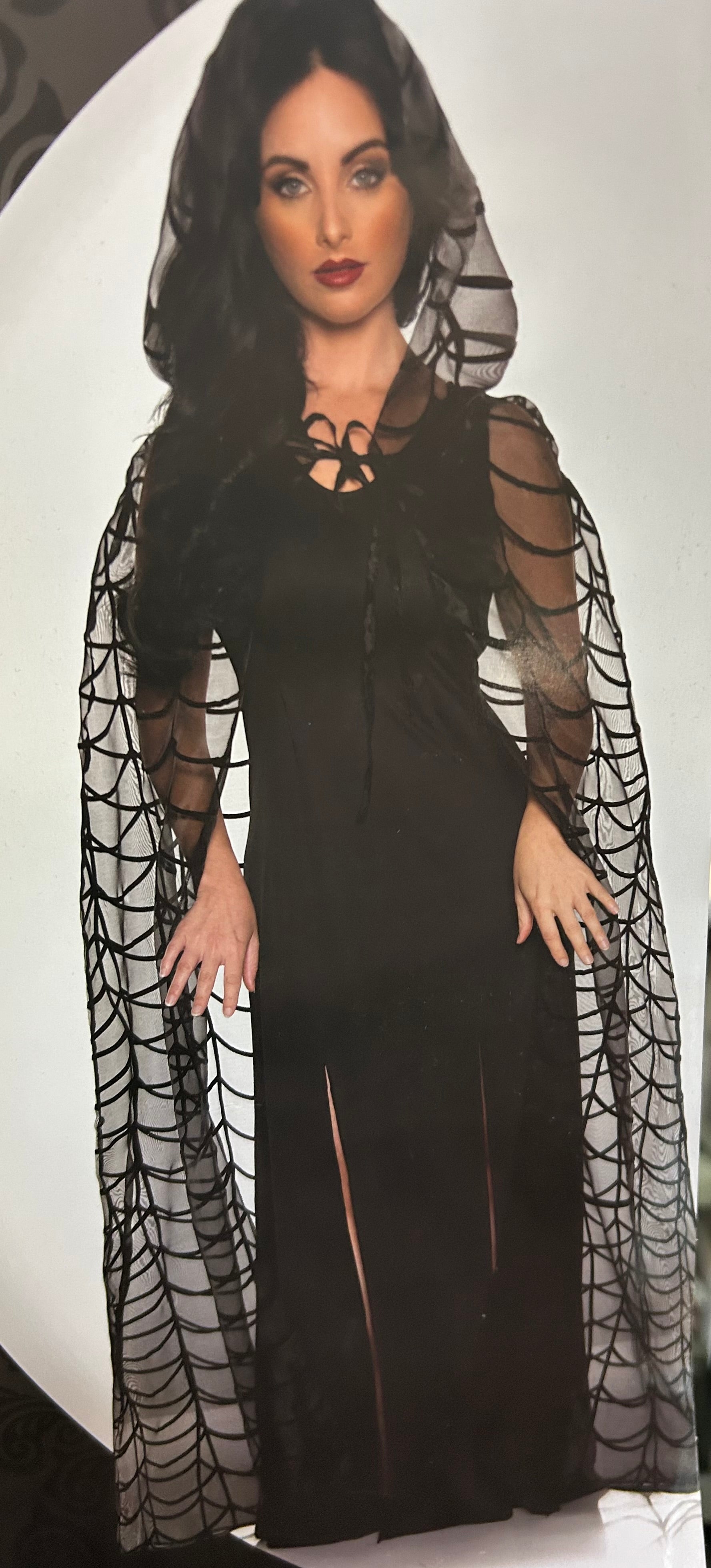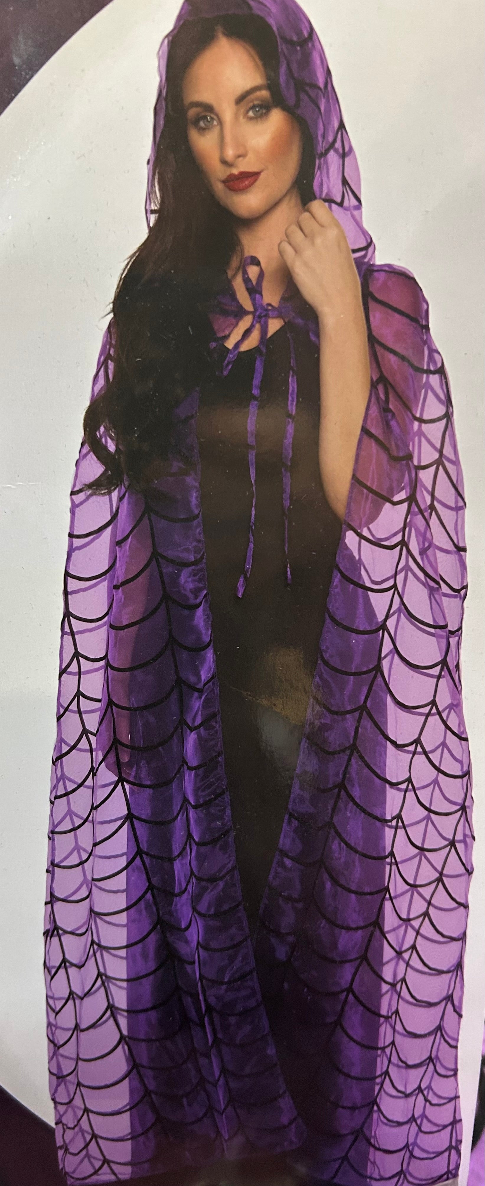 This full-length hooded cape showcases a delicate sheer fabric adorned with an intricate spiderweb print, blending elegance with a touch of mystery. Its generous length and flowing design create a dramatic silhouette, while the hood adds an extra layer of allure and versatility. Perfect for costume events or theatrical occasions, this cape offers both visual impact and comfortable wear.