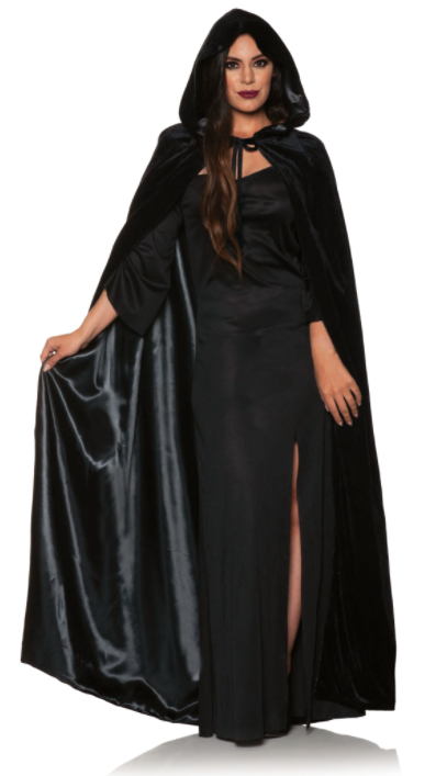 Velvet hooded cape with satin lining, tie-front cape with hood.