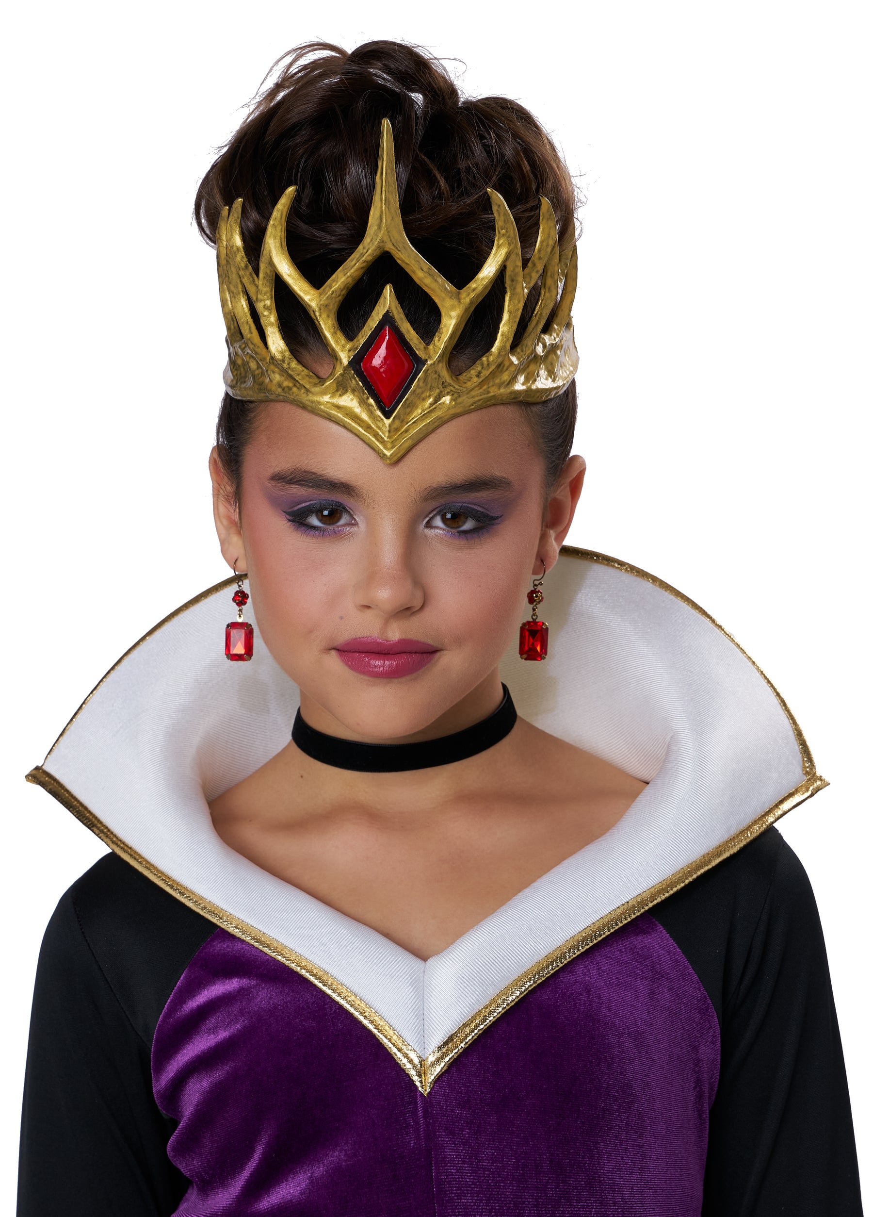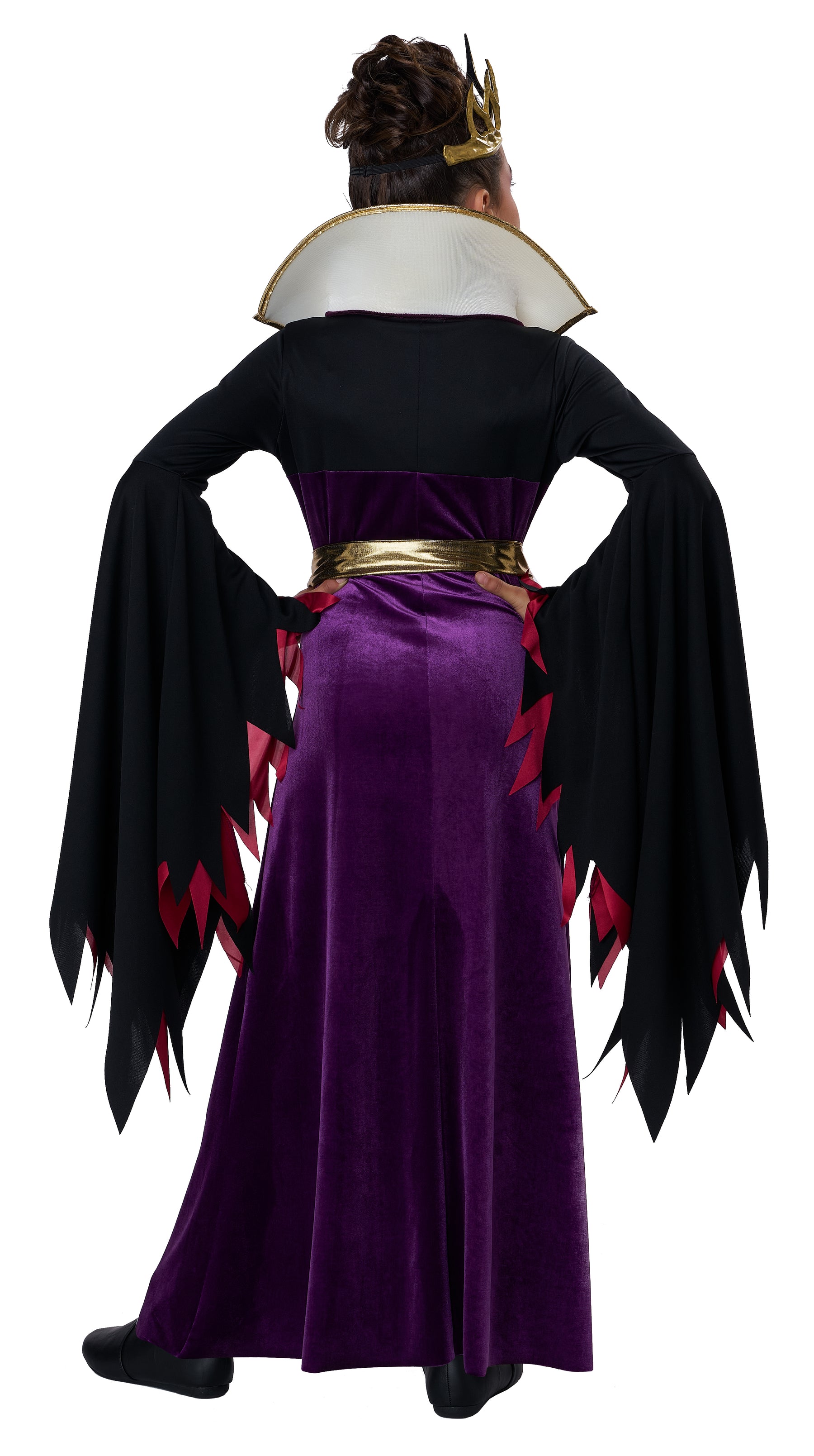 Product Description: A purple velour long dress with dramatic sleeves and collar. Flared sleeves layered in black and red fabric, White collar is backed with foam and can be worn popped up. Shimmering gold fabric belt/sash comes with a plastic red rhinestone buckle. Spiked gold crown is made of vinyl and has an elastic band in the back for ease of wear. Mirror, mirror, who's the fiercest of them all? This storybook evil queen costume the one ready to command her kingdom in style! Featuring a floor-length purple velour dress and dramatically flared layered sleeves. This costume also includes a gold fabric waist sash and buckle and a crown. Perfect for a young villainess in charge.