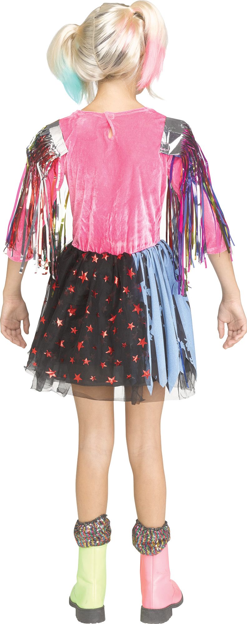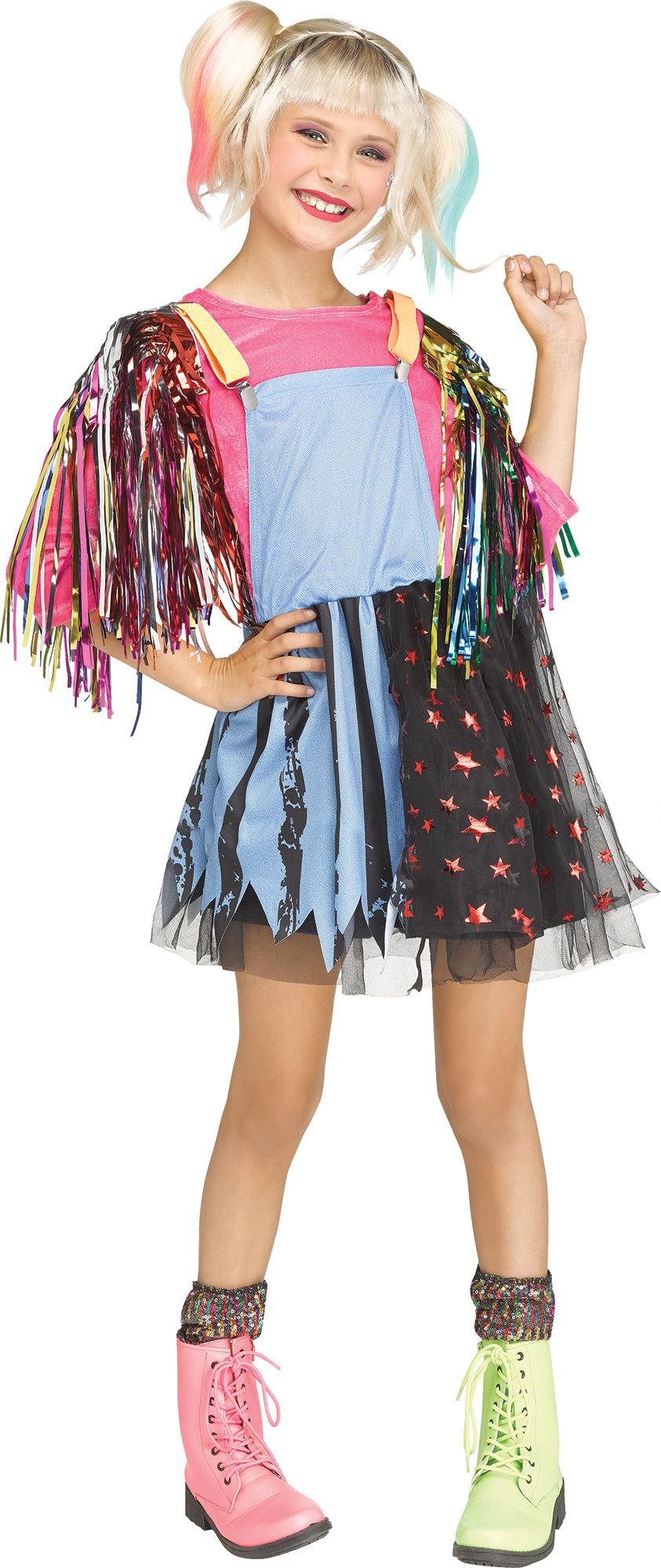 This dress is all about mixing sparkles with rough edges. The overalls style on the front is actually attached to the pink shirt underneath. The skirt portion of the dress is half ragged blue stripes, half black tulle and pink stars. We especially love the tinsel epaulettes on the shoulders, each featuring different colors from the other. They attach to the dress with Velcro type fasteners. This costume is available in Medium (8-10), Large (12-14) and Extra Large (14-16). Wig, socks and boots are NOT included.