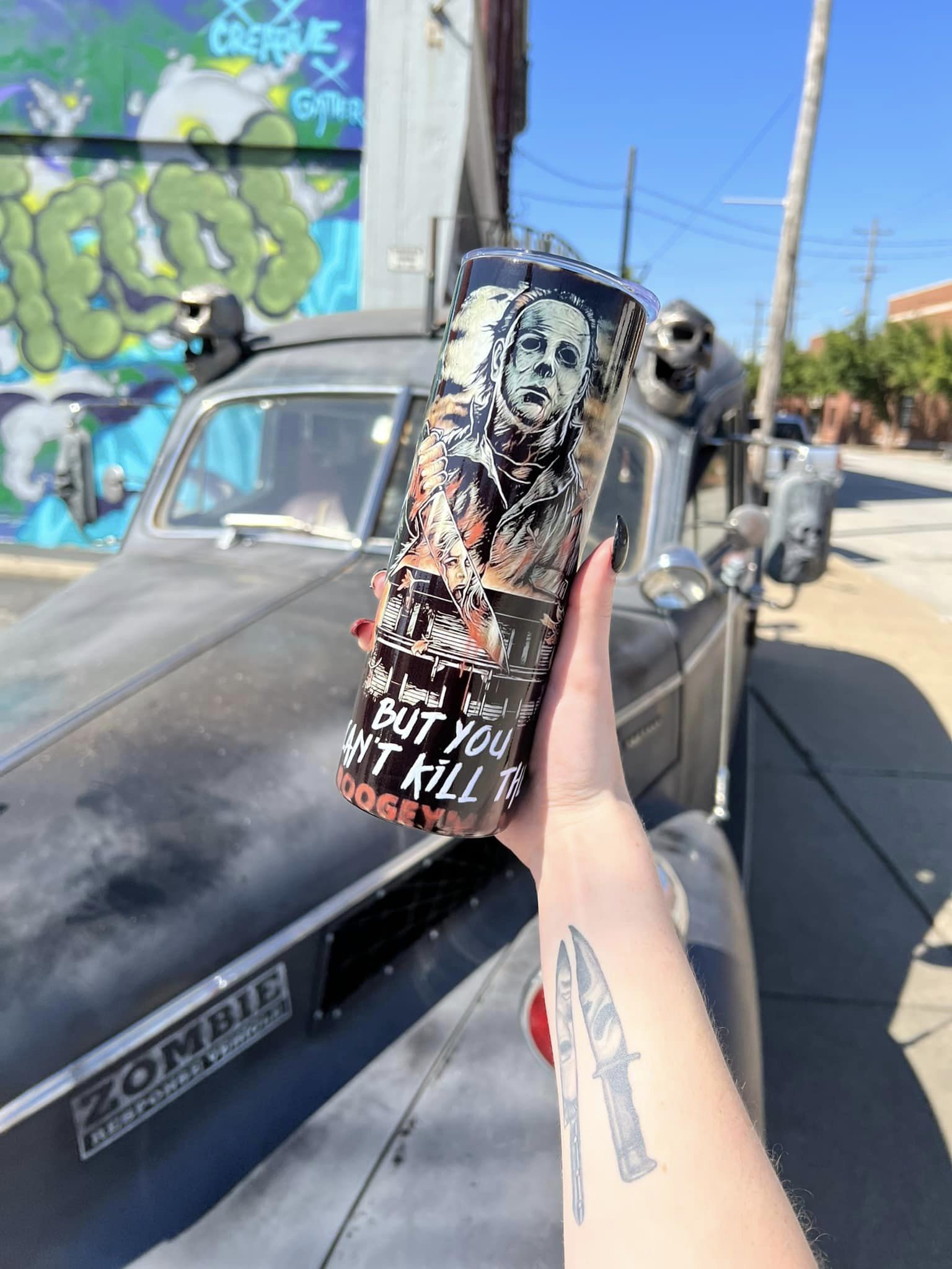 Sip your drinks in style with the 20 oz. Metal Tumbler - Michael Myers! Equipped with a design that reads "But You Can't Kill The Boogeyman," this tumbler not only looks deceptively scary, it also keeps drinks hot or cold all day. Go ahead, give it a try--if you dare!