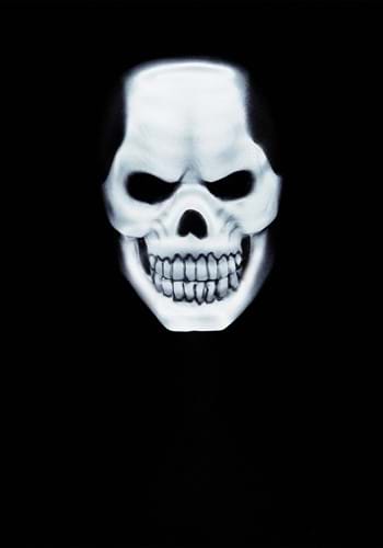 A boney grin is within. The Skull Mask lights up white. It comes with an attached hood. Mask has a wired battery box / controller with 3 light settings: on, slow flash and strobe flash. Mask has two layers with light up EL wire in between. The glow works best in low light settings. Uses 2 x AA batteries (included).