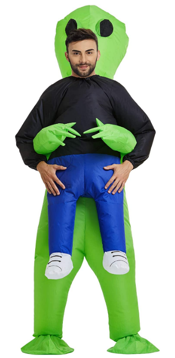 You're going to take them to your leader whether you like it or not in this Carry Me Alien Inflatable Costume! Simple and easy to wear just step into the costume zip it up and turn on the fan to inflate. The fan battery operated and is kept in a small pocket so costume stays inflated with ease. Fan operates on 4 AA batteries (not included). One size fits most adults.