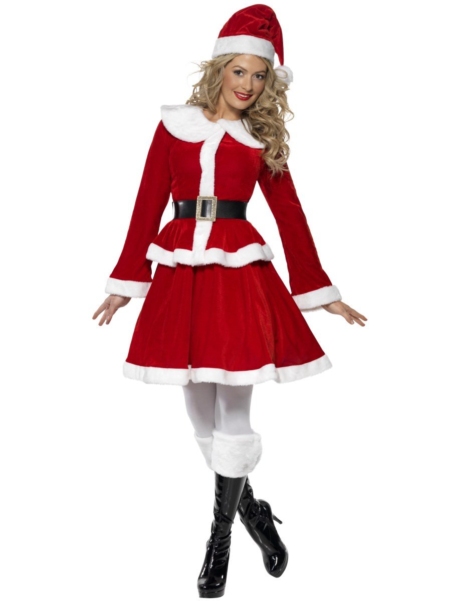 Ho ho ho! Spread the Christmas cheer with the Miss Santa Costume With Muff Costume. Included is a muff, jacket, skirt, hat and belt.