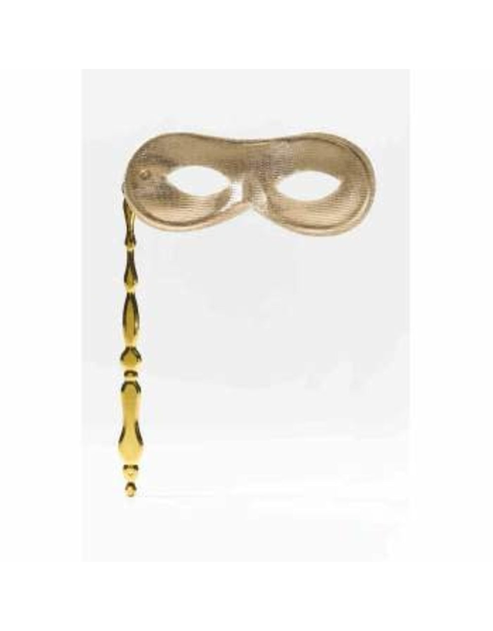 This solid Metallic Domino eye mask on a plastic stick is made of lame fabric laminate over a plastic flexible form. Stick is movable. One size fits most.