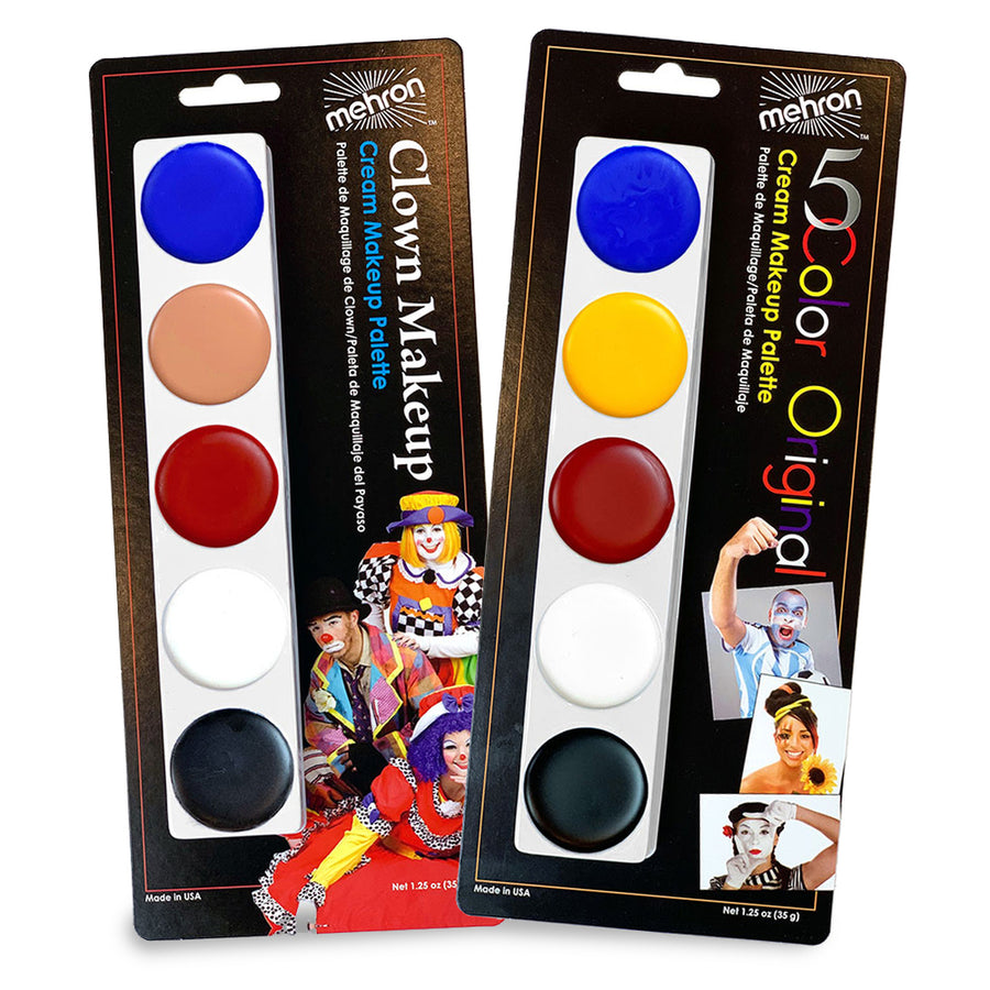 Mehron’s Cream Makeup 5 Color Palette is used by top professionals for easy access to 5 staple shades. The Original (#405) Palette includes the necessary basic colors to compliment any artists creativity: White (102-W), Red (102-R), Blue (102-BL), Yellow (102-Y) and Black (102-B). The Clown Palette (#406) is designed to create various clown looks: White Face, Auguste, Character, and Tramp/Hobo. Shades included in the Clown Palette are: Clown White (130), Really Bright Red (102-RB), Blue (102-B), Juvenile (102-3B) and Black (102-B).