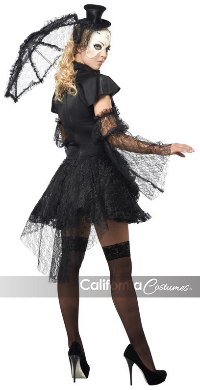 Sexy, dark, and just the right amount of freaky. Platinum Collection's Victorian Doll is a dress with an attached collar piece and detachable lacy sleeves. This detailed costume also comes with a cracked half mask, mini top hat with lace attachment, and a lace parasol. Shoes not included.