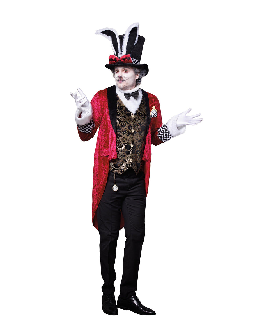 This men's white rabbit costume features a red velvet jacket with pocket watch applique, black-and-white checkered cuffs, and black and gold clock-printed vest with attached faux-fur dickey and black satin bow tie.