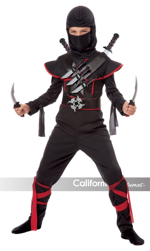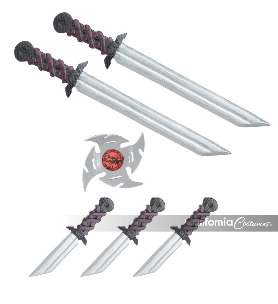 Gear up your ninja costume with this stealthy weapons kit. The Stealth Ninja Weapons Belt includes three daggers, two swords, one ninja star, and holding cross belt.