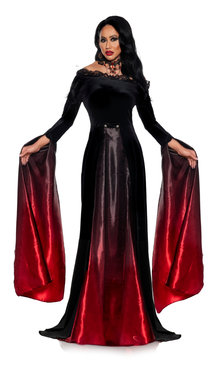 Step into the night in this Elegant Vampire Adult Costume. A daring combination of black and red ombre make this dress stand out, while the extended sleeves add an extra layer of mystery. Let your fun side howl and be the life of the party!