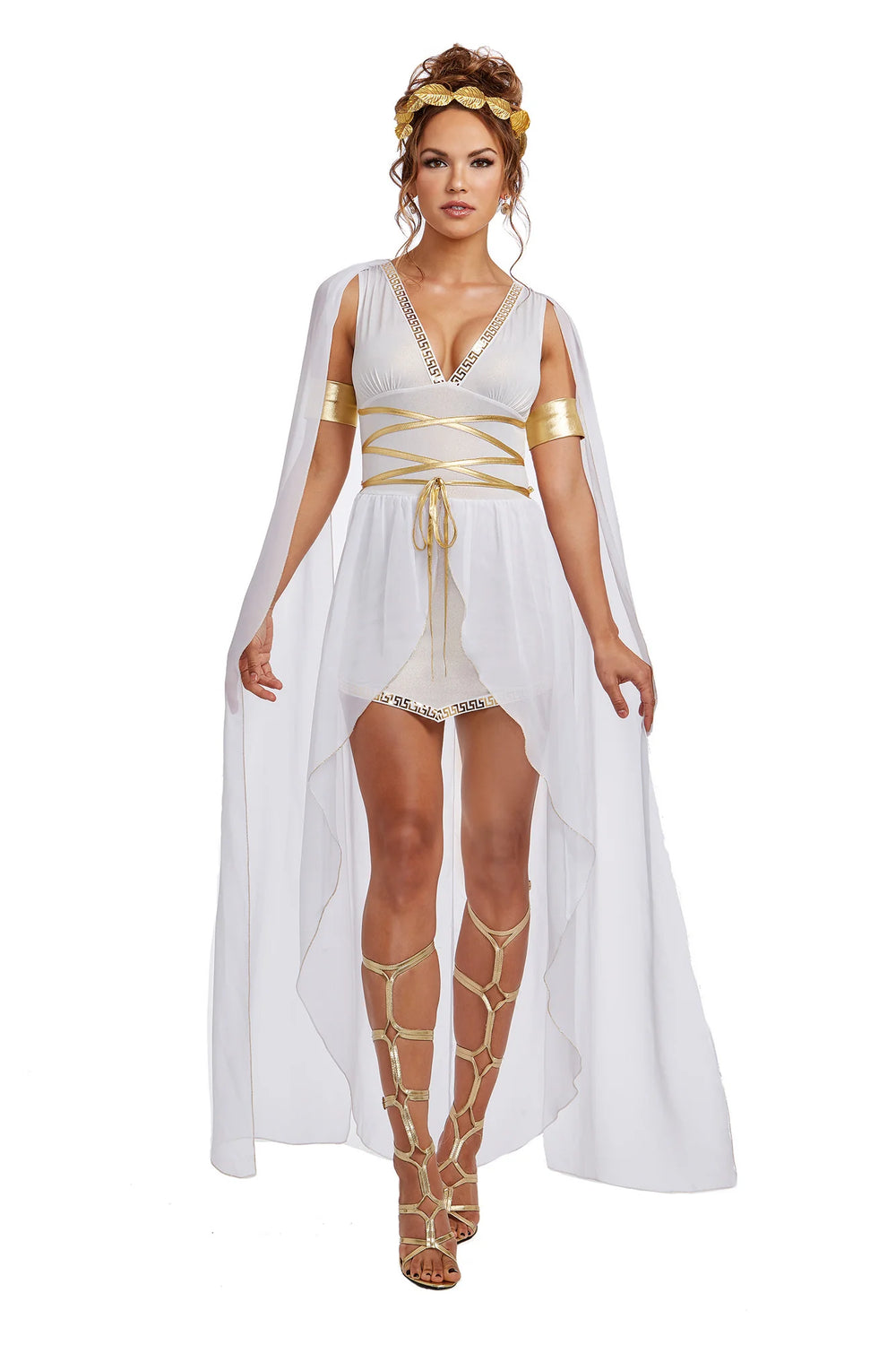 Mythical Goddess Elegance: Step into the aura of a mythical goddess with this elegant costume. The dress features a sheer overskirt, cascading chiffon sashes, and intricate gold trim embellishments for a truly regal appearance.