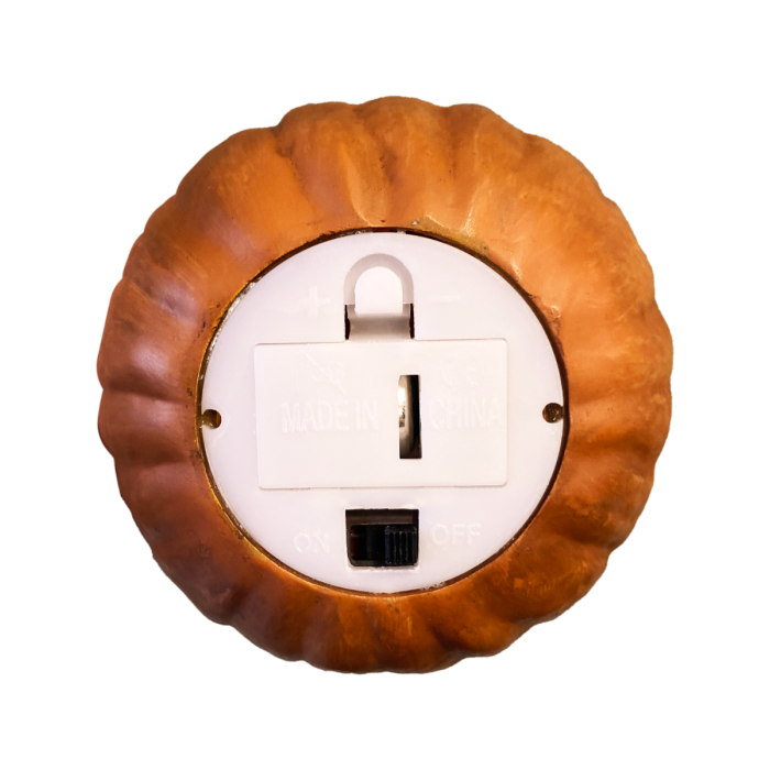 This amazing ornament is made in resin and is meticulously painted to perfection. The light up feature is activated by a small switch on the bottom of the pumpkin. Battery is included. In addition, the ornament comes in a beautiful Collectors Window Box.