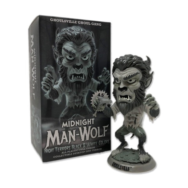 Feast your eyes on "Night Terrors" Midnight Man Wolf, in shivering shades of grey. Just like the midnight movies late, late show. Be careful, he'll drain the color out of you!