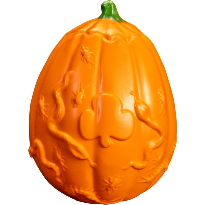 This classic blow mold Jolly Jack O'Lantern is based on the Silver Shamrock Pumpkin Mask and includes sculpted snake, bug, and shamrock details on the back of the pumpkin. This amazing pumpkin has 2 modes - steady on & Blinking with music.