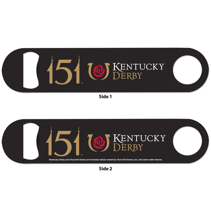 This officially licensed Kentucky Derby 151 Double Sided Bottle Opener is a heavy duty bottle and can opener, perfect for fans and collectors of the iconic event. Made of durable metal, it features a round can tab opener on one end and a sturdy bottle opener on the other. Printed on both sides, it makes for a great souvenir or collectible, ideal for any occasion. Measures approximately 6".