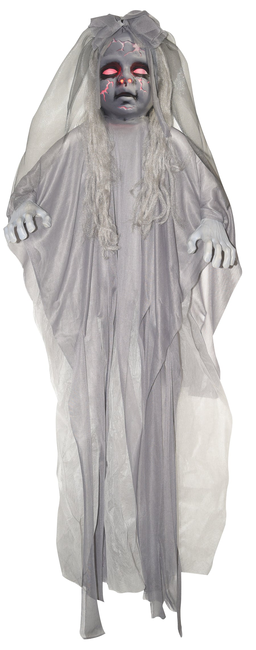 Create a truly spooky atmosphere with this Hanging Light Up Girl Animated Prop. This prop features a creepy doll with light-up eyes that measures 47"x35"x5", adding the perfect eerie touch to your home. It requires 2AA batteries (not included). Set the perfect scene this Halloween.