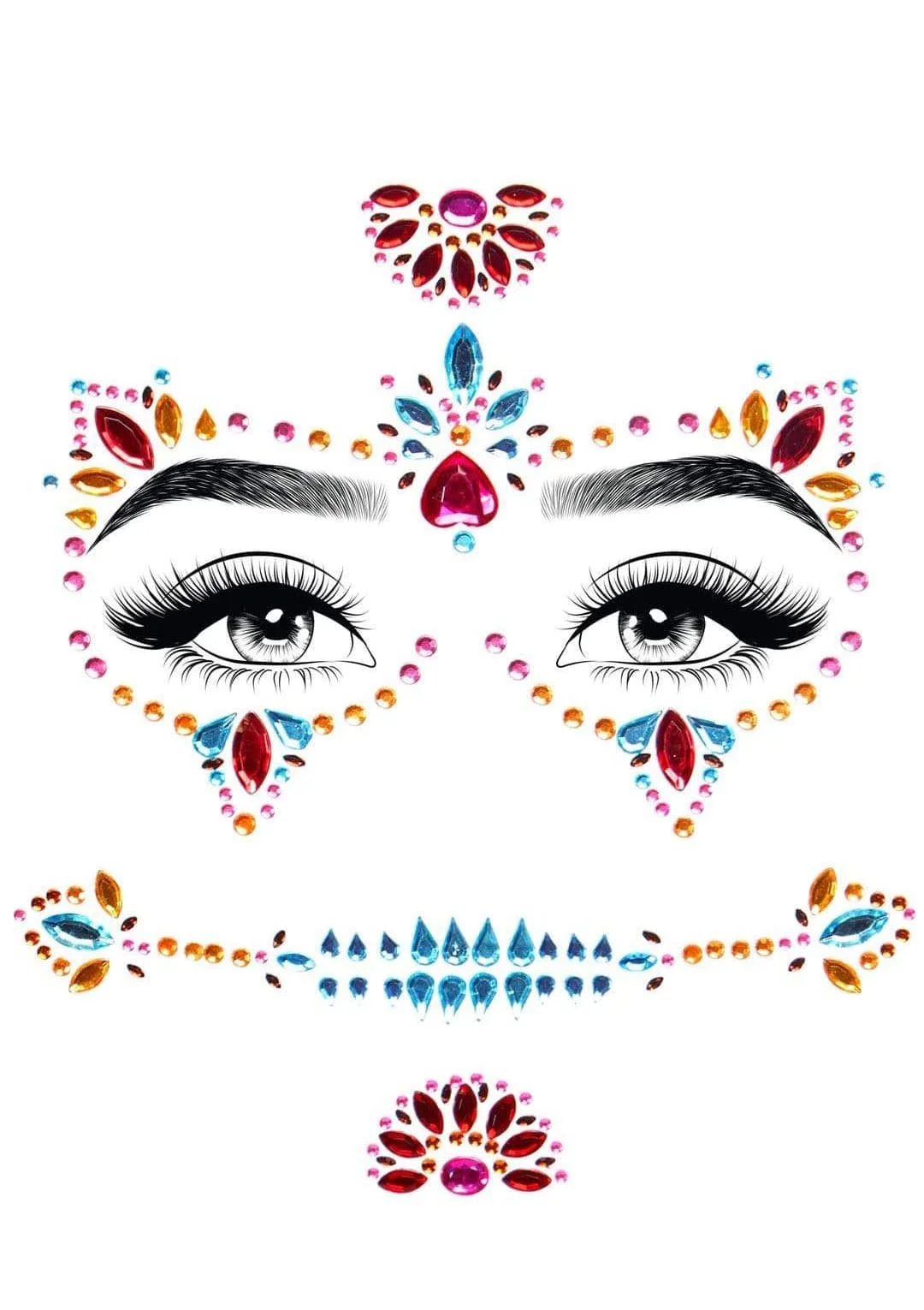 Unleash your wild side with these striking Day of the Dead skull-patterned face jewels. Vibrant red, gold, aqua blue, pink, and orange gems create a bold statement that demands attention. These self-adhesive jewels apply effortlessly and remove cleanly, letting you transform your look as often as your mood changes. Perfect for festivals, parties, or whenever you're feeling fearlessly fabulous.