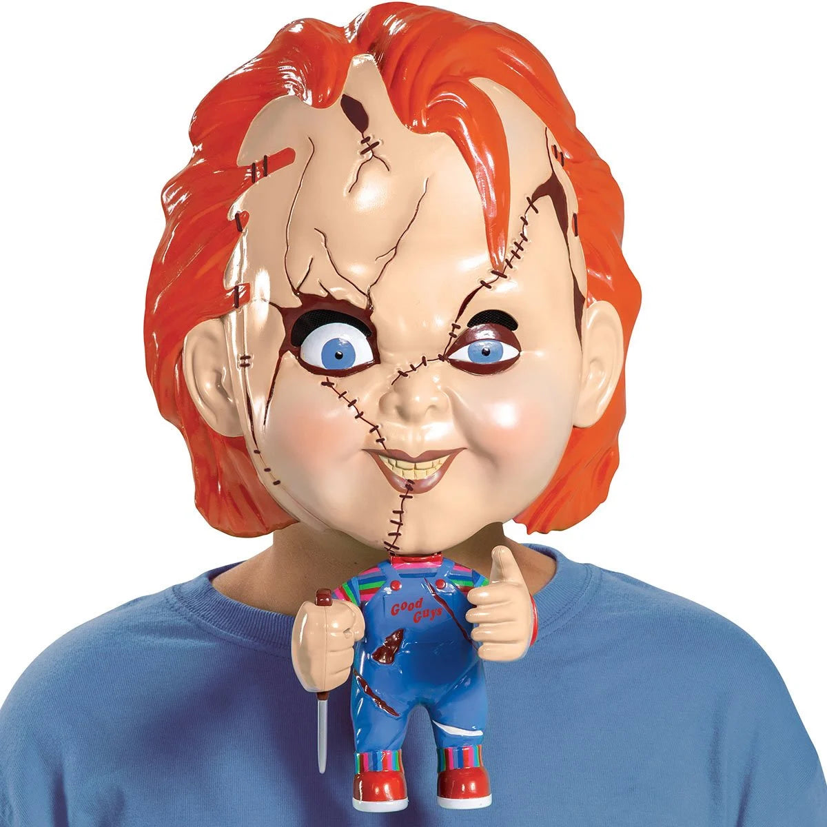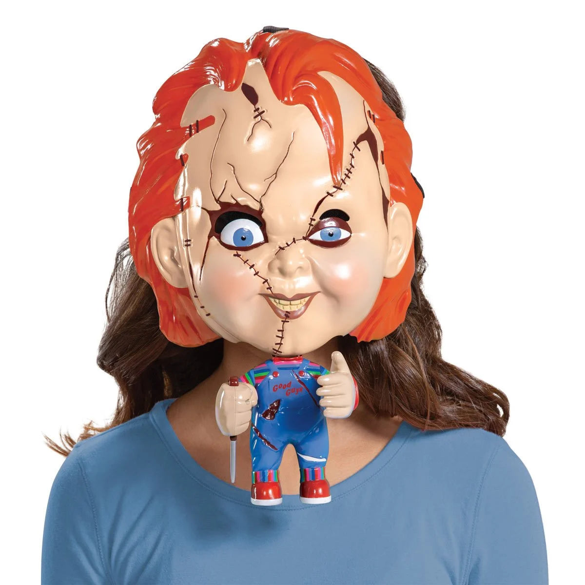 Inspired by the popular 80's horror film, Child's Play, comes this Child's Play Chucky Move-a-Mask! Watch as Chucky's arms come to life when you push on the lever with your chin. Includes one mask.