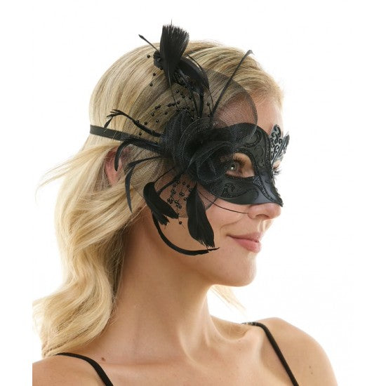 Black Fascinator Half Mask with Tulle Flower & Feather