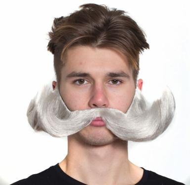 • For your larger than life personality, no ordinary moustache will do. This oversized Oompahpah Moustache was made for you! Constructed in a synthetic fiber, this hysterically huge Handlebar Moustache curls up neatly at the corners and extends to the sides so it resembles sideburns as well as a moustache. The facial hair is stitched onto a fabric piece so it will stay neatly in place and is held up by lengths of white elastic that stretch behind the wearers head.