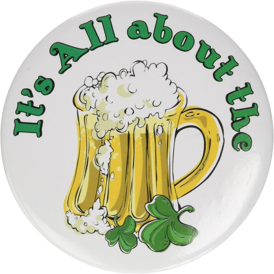 "Get ready to celebrate St. Patrick's Day with our festive metal button! Featuring a fun beer design, this button is perfect for showing off your Irish pride and enjoying a cold one with friends. Add some flair to your outfit and get ready to party!"