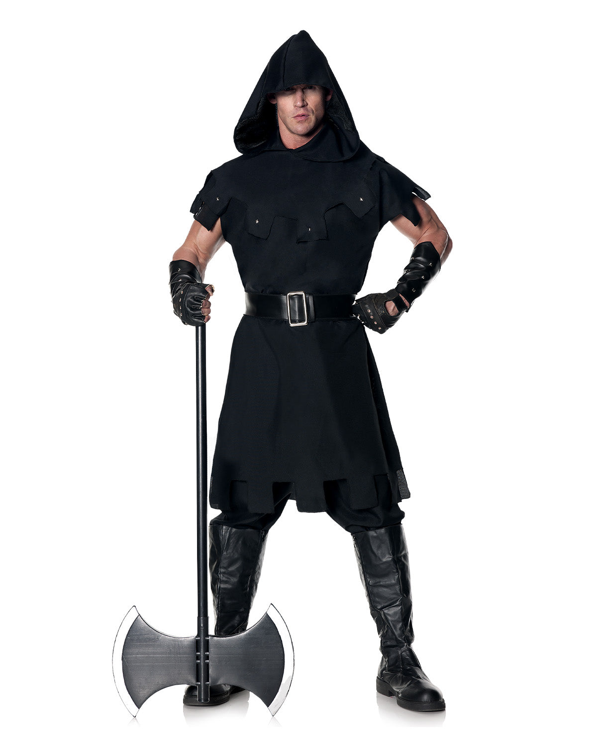 Tunic collar with attached hood, pants arm cuffs and belt.