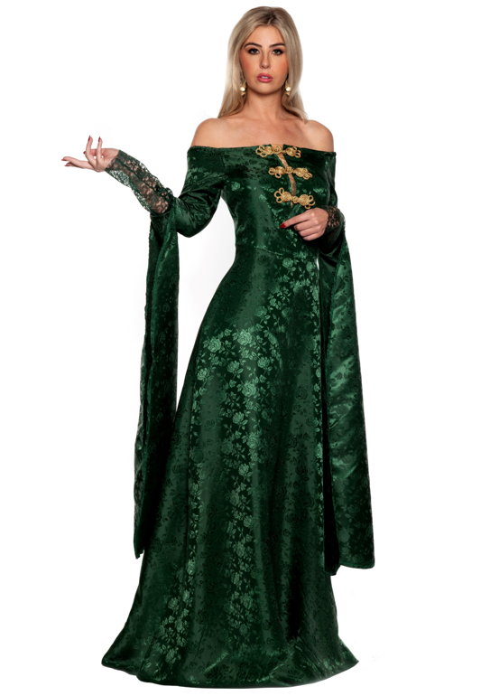 Dare to be courageous! Go back in time and reign as the daring queen you were born to be. Step into the bold Renaissance Queen Adult Costume and show off your regal style with a green dress featuring cold shoulder and striking brocade print. Perfect for any Halloween or costume event! Let your inner queen shine!