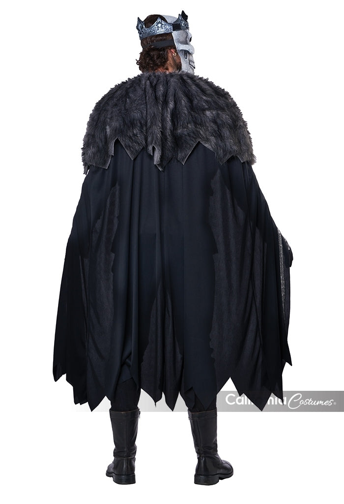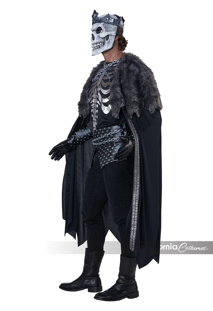 This King of the Dead Skeleton Costume for adults features a detailed shirt with a skeleton bones imprint, complemented by a dramatic cape trimmed with faux fur and adorned with chains. The ensemble includes a matching belt with chains and wrist guards to enhance the regal yet eerie look. A soft foam latex mask provides full frontal coverage, completing the haunting visage, while a king’s crown crowns the outfit. Please note, pants are not included. Ideal for Renaissance-themed events, this costume combines authenticity with striking visual impact.
