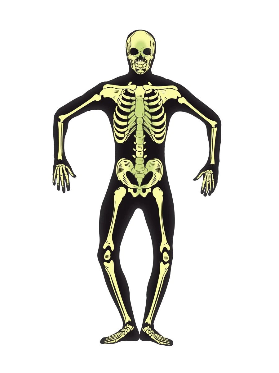 This Skeleton Glow in the Dark Second Skin Costume is perfect for the scary season. This alternative costume comes with a concealed fly and under chin opening. Glows in the dark after being exposed to light for a short time. Glows consistently under black light.