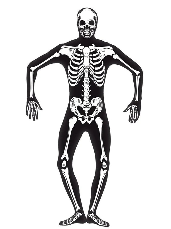 Skeleton Second Skin Costume, Black, with Concealed Fly & Under Chin Opening, GID